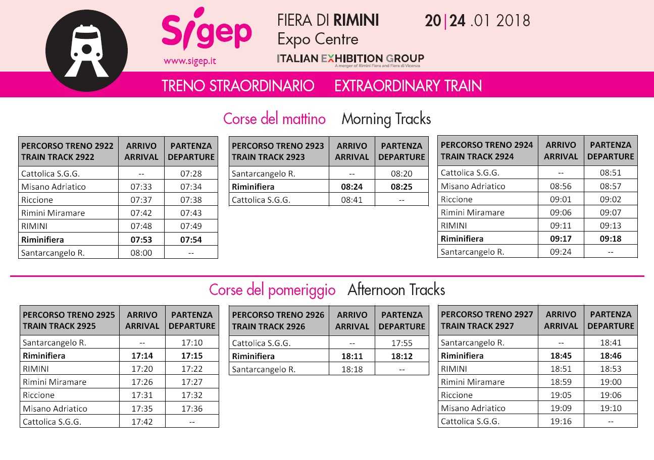 Per l’occasione, è stato previsto un treno speciale Sigep (novità 2018). Questo collega dunque Cattolica/Santarcangelo e Santarcangelo/Cattolica. Tuttavia è a pagamento. In questo modo i biglietti sono acquistabili anche on line sul sito di Trenitalia