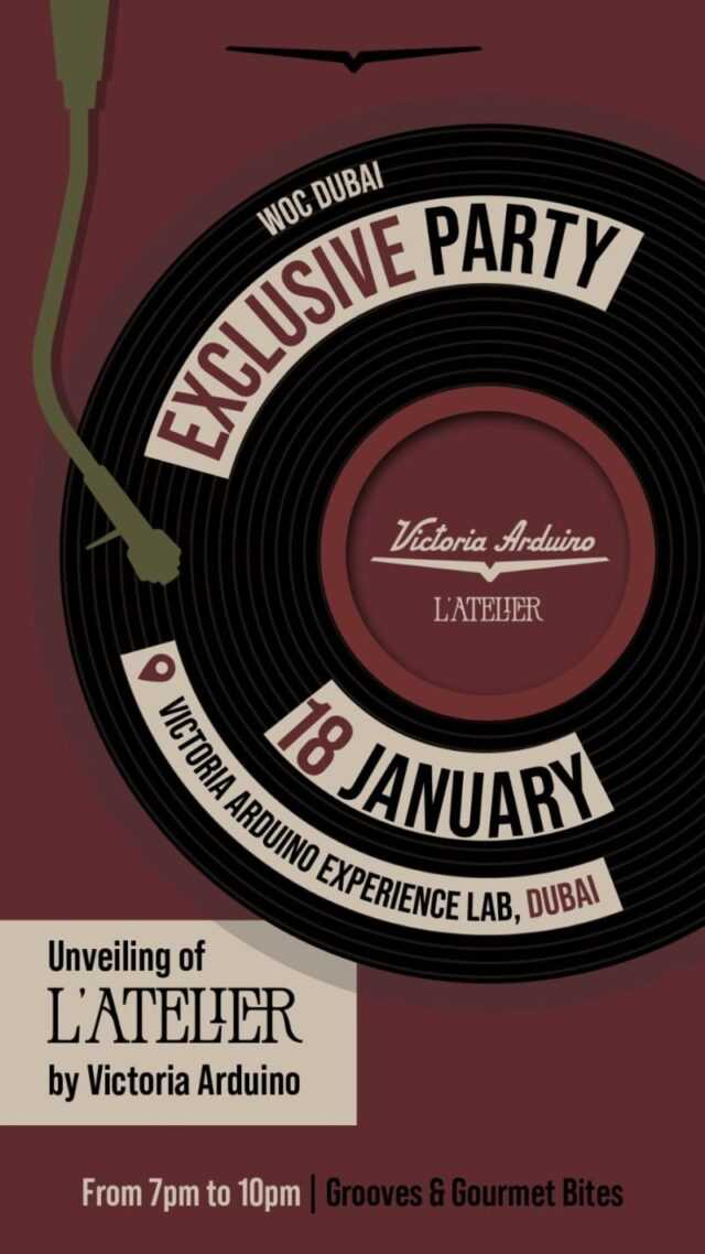 - Victoria Arduino Exclusive Party: L’Atelier approda a Dubai. Victoria Arduino ti invita il 18 gennaio alle ore 19:00 presso il suo Experience Lab a Dubai per scoprire L’Atelier, un nuovo spazio narrativo dedicato a creatività, artigianalità e design senza tempo.