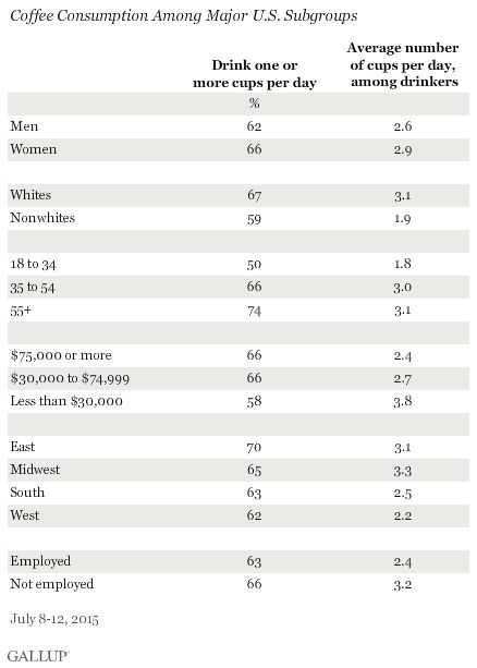 La percentuale di consumatori quotidiani è più alta tra le donne (66%) che tra gli uomini (62%). Anche il consumo medio quotidiano è superiore tra le americane (2,9 tazze al giorno) che non tra gli americani (2,6 tazze). La popolazione bianca beve molto più caffè di quella non bianca. La proporzione di consumatori abituali aumenta al crescere del reddito, ma nelle fasce meno ricche chi consuma caffè ne beve di più (media di 3,8 tazze al giorno per i consumatori sotto i 30 mila dollari all’anno, contro 2,4 tazze per quelli di reddito superiore ai 75 mila dollari). All’est si beve più caffè che all’ovest e i consumi sono maggiori tra i disoccupati che tra gli occupati.