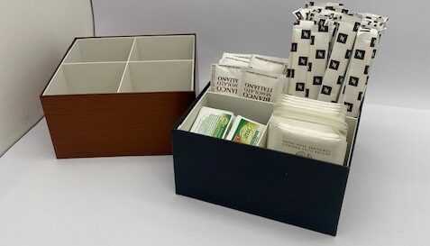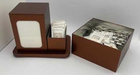 Si tratta di una linea composta dal set: porta salviette e porta zuccheri da tavolo che abbinati ad un vassoio sempre in metallo e possono formare un perfetto e ordinato completo per il tavolo. Inoltre, della stessa collezione è presente un capiente porta zuccheri da banco anche nella versione con quattro scomparti per la suddivisione dei vari tipi di zucchero e dolcificanti.