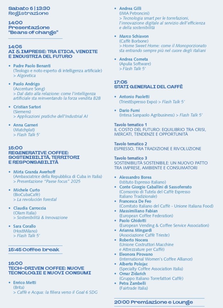 Paoletti ha spiegato che “Trieste Capitale del Caffè, che oltre ad essere una identità è anche un marchio registrato, si conferma realtà anche in quest’autunno con quella che intende essere una collaborazione all’insegna di una identità tutta triestina. La Camera di commercio che organizza TriestEspresso Expo, assieme all’Associazione caffè Trieste al Trieste Coffee Festival e a Trieste Coffee Experts sostiene e co-organizza una serie di eventi aperti a tutta la città. Se da un lato TriestEspresso Expo che si svolgerà dal 21 al 23 ottobre 2026 si conferma la fiera internazionale biennale professionale di riferimento per l’espresso italiano, la continua collaborazione assieme alle imprese del settore e alle associazioni di categoria – ha concluso Paoletti – contribuisce a diffondere la cultura del caffè sul territorio”.