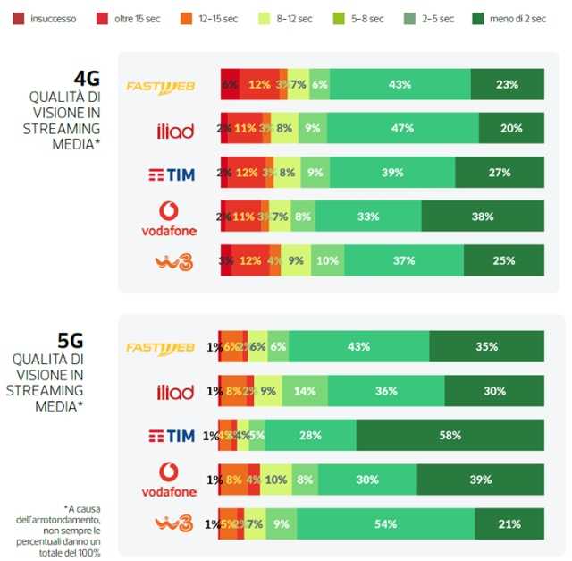 In più, il test verifica il tempo di caricamento e di attesa del video selezionato, eventuali pause (buffering) e tempi di attesa. Per ritardi inferiori ai 12 secondi, la qualità di streaming viene considerata buona; ritardi superiori o un fallimento nel caricamento del video vengono considerati negativamente. Per ogni operatore viene conteggiata la percentuale di successo.